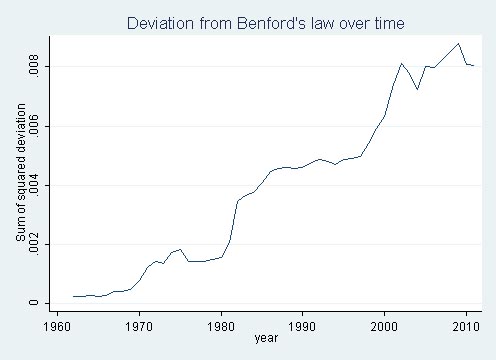 Deviations from Benford’s law have increased substantially over time, such that today the empirical distribution of each digit is about 3 percentage points off from what Benford’s law would predict. The deviation increased sharply between 1982-1986 before leveling off, then zoomed up again from 1998 to 2002. Notably, the deviation from Benford dropped off very slightly in 2003-2004 after the enactment of Sarbanes-Oxley accounting reform act in 2002, but this was very tiny and the deviation resumed its increase up to an all-time peak in 2009.