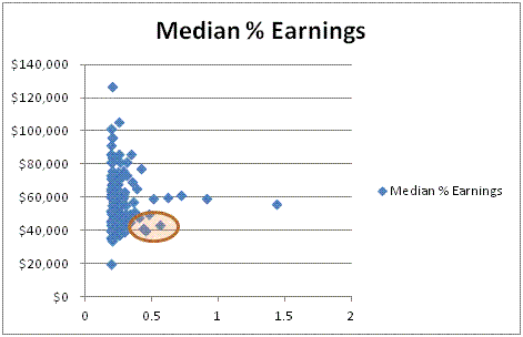 I’ve circled two very different kind of outliers in my analysis. My little circle surrounds three majors in both images. They are: