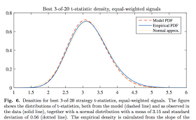 The extent of this bias is impressive. Here is the distribution of t statistics that results when you pick the best three of 20 completely useless signals, and put them in a portfolio. Critical values of 4 and 5 show up routinely in Robert’s calculations.
