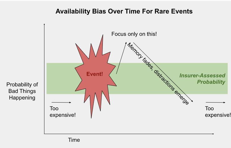 Availability bias is also a fickle master: memories fade and our limited focus gets distracted by the next crisis or the one after3. Eventually we find other needs for the resources devoted to mitigation and let insurance coverage lapse.